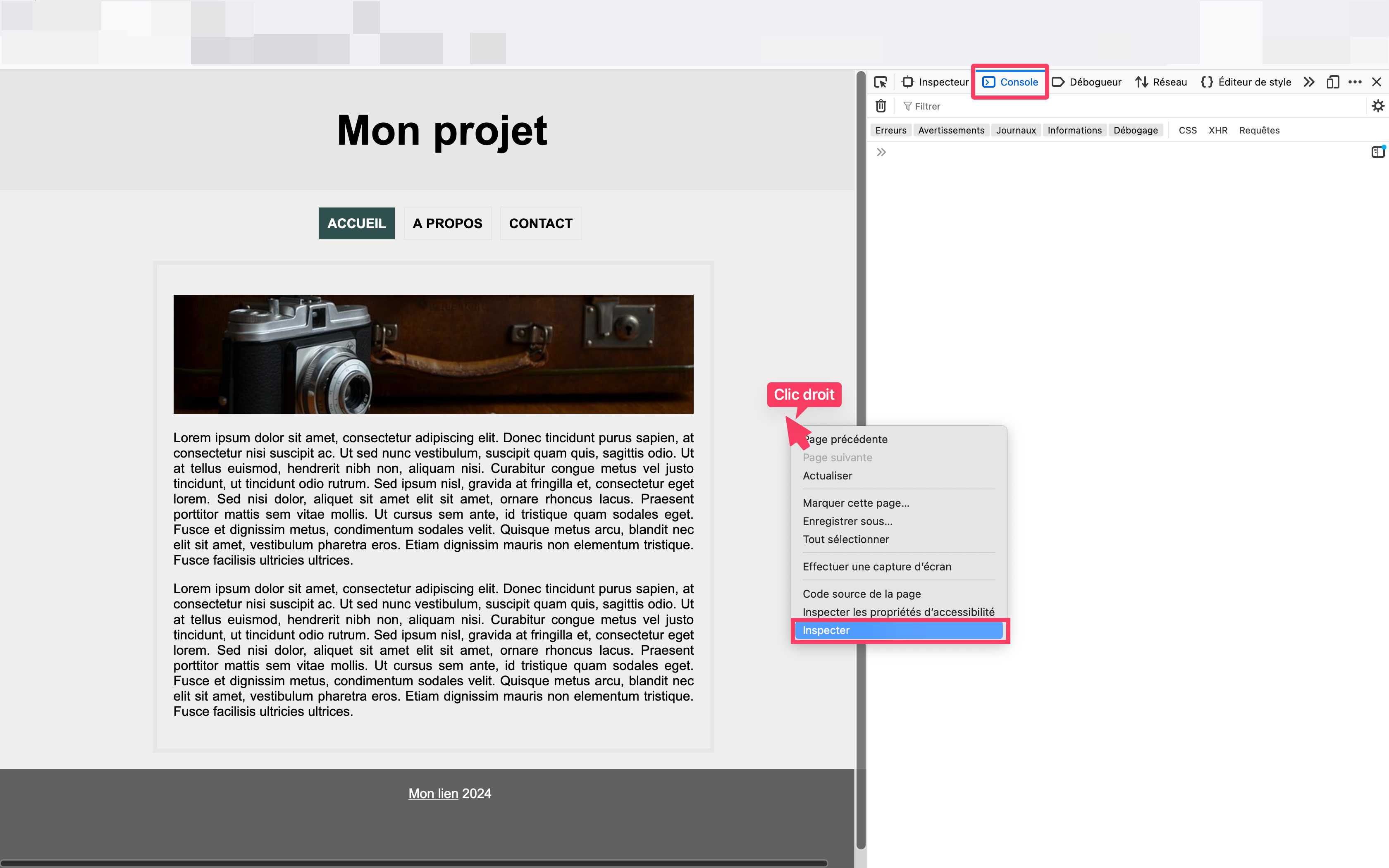 <footer> <a href="#">Mon lien</a> 2024 </footer>