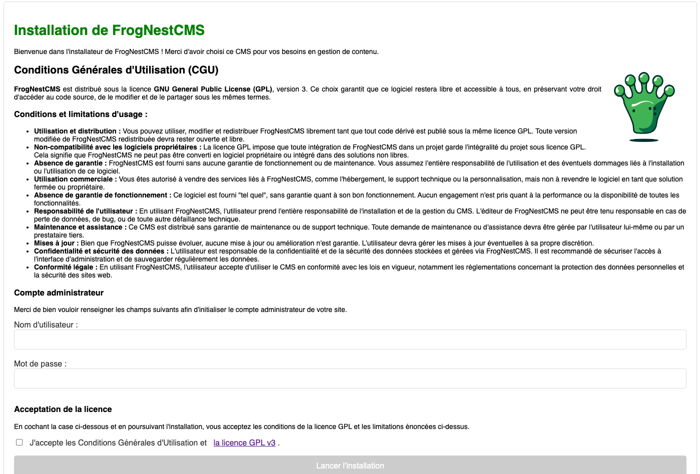 FrogNestCMS est un système de gestion de contenu open-source distribué sous la licence GNU General Public License (GPL) version 3. Ce CMS est conçu pour fournir une base accessible, modifiable et extensible pour créer des sites web dynamiques et personnalisables.